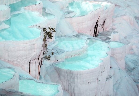 Dazzling white calcium terraces formed by mineral rich thermal waters flowing down the hillside.